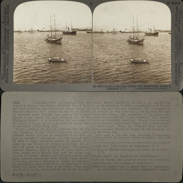 Underwood #U4544. Boats lie at anchor near shore of Manila Bay; Manila Cathedral in distance.