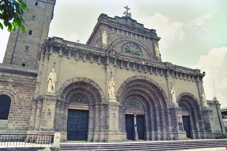 Subject: The stepped-in arches of the front entry are a sure sign this is the Minor Basilica and Metropolitan Cathedral of the Immaculate Conception, better known as Manila Cathedral, in Intramuros, M
