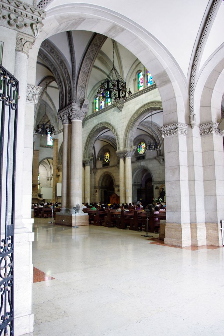 Subject: Vaulted ceilings, stained-glass windows, and architectural details inside the Minor Basilica and Metropolitan Cathedral of the Immaculate Conception, better known as Manila Cathedral, in Intr