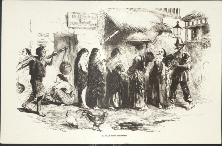 Subject: Street scene of a group of Filipino women in traditional dress at a stall in old Manila. Although not specified, these prints are similar t