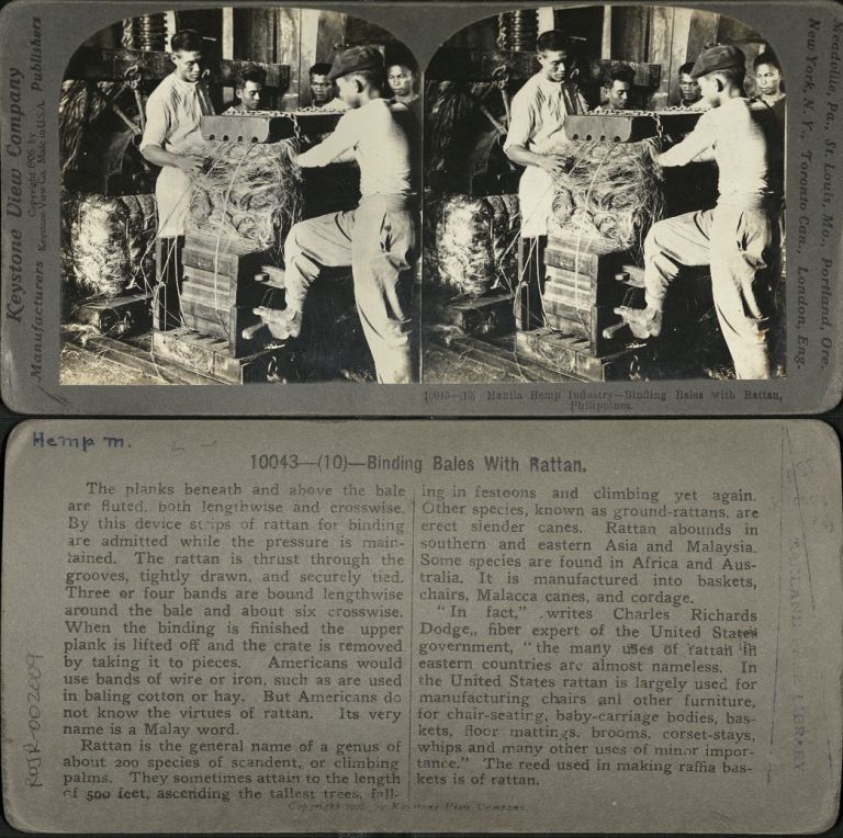 Keystone #K10043. Filipino men use a machine to bale bundles of Abaca fibers (used in making rope and cloth) in a warehouse.
