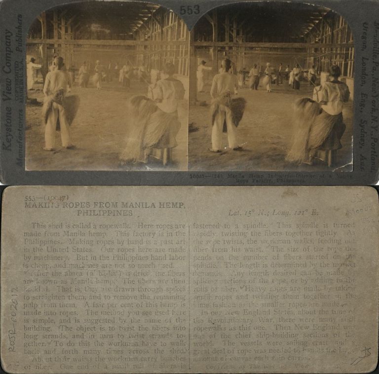 Keystone #K10047. Filipino workers weave Abaca fibers into Manila rope by hand on a "ropewalk" inside a large factory.