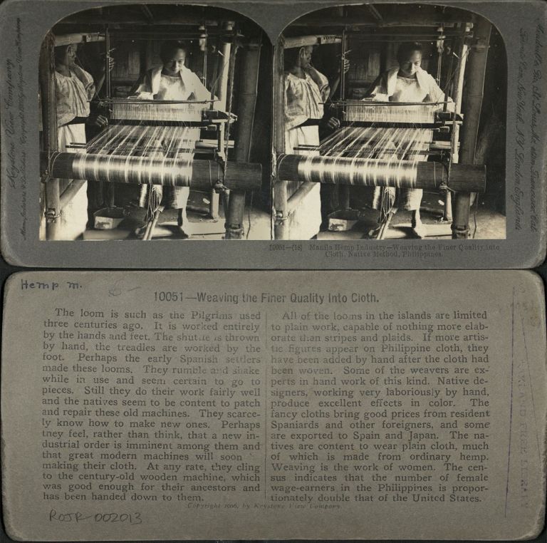 Keystone #K10051. Two Filipina women operate a wooden loom by hand, making cloth from fine Abaca fibers.