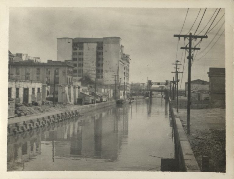 Subject: The Binondo Canal was a popular way of moving goods into this commercial center. The superstructure of the vertical lift bridge is seen in the distance; it is the same one seen in ROJR-000969