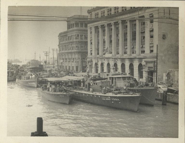 Subject: U.S. Army boats tied up on the Pasig River wharf in Binondo. On left is the El Hogar Filipino Building, built in 1914 and notable for its Beaux-Arts style architecture. On right is the First