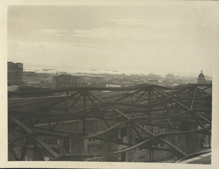 Subject: View over a fire-damaged roof structure looking west to warships in Manila Bay. The bell tower of Binondo Church is seen far right.
