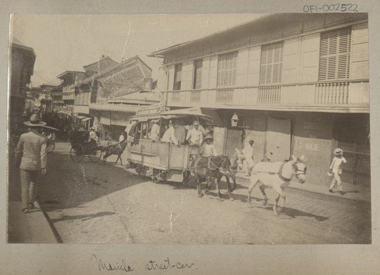 Subject: A streetcar pulled by a team of small horses on a Manila street, with pedestrians and carromatas. Lieut. Munson M. Z. Guthrie was an officer in Company A, 1st South Dakota Volunteer Infantr
