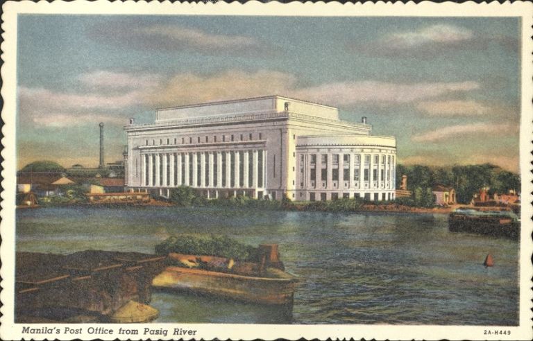 Subject: Postwar print showing rebuilt Manila Post Office across Pasig River with old pilings of destroyed Jones Bridge.