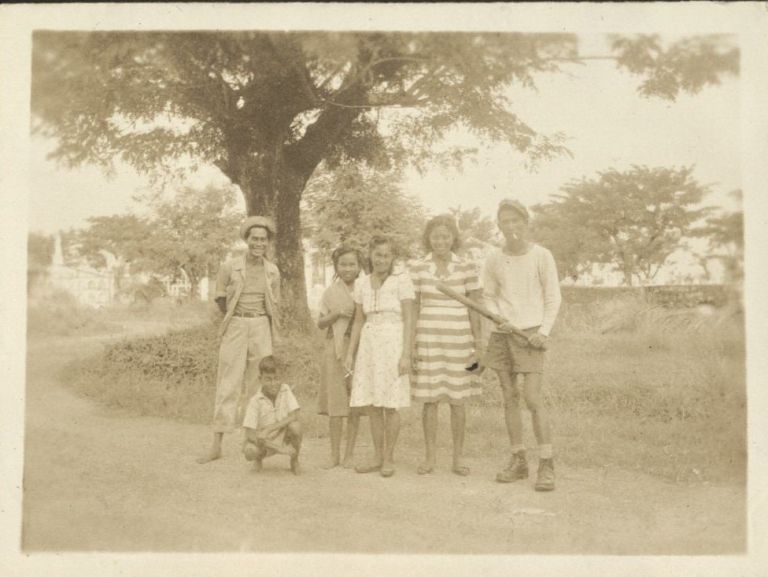 Subject: A smiling group of young Filipinos pose with a baseball bat on a road through the cemetery. The Manila Chinese Cemetery is the second oldest cemetery in Manila after La Loma. It was designate