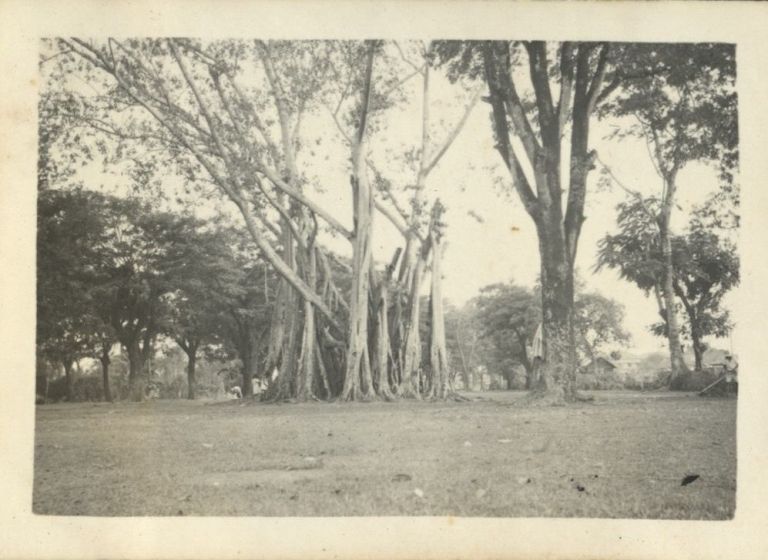 Subject: Threes in the cemetery, including a large Banyan tree (center). A Banyan tree is a member of the fig family, and usually its seeds get dropped by birds onto other trees or structures, growing