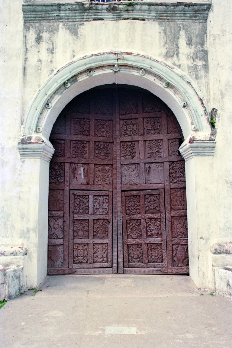 Subject: Detail of the arched doorway and carved door of the Our Lady of the Assumption Parish Church, commonly known as Maragondon Church, in the municipality of Maragondon, Cavite. The ornate door i