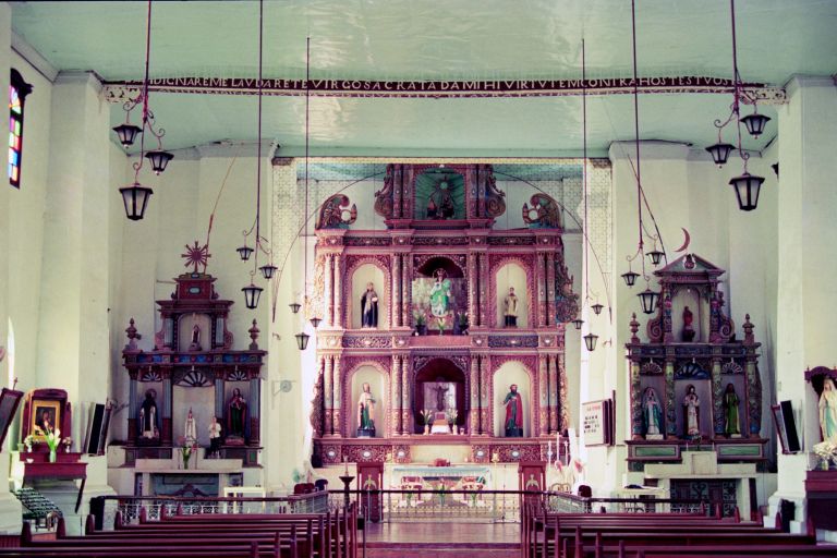 Subject: The Our Lady of the Assumption Parish Church, commonly known as Maragondon Church, in the municipality of Maragondon, Cavite. "There are three church retables, all brightly polychromed. The i