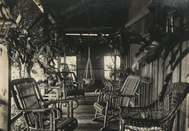 Subject: Nicely appointed patio with rattan and wicker furniture, hanging plants, and sun blinds. No location is given but we know from OFI-004494 that the Baird family departed Iloilo on Nov. 30, 191