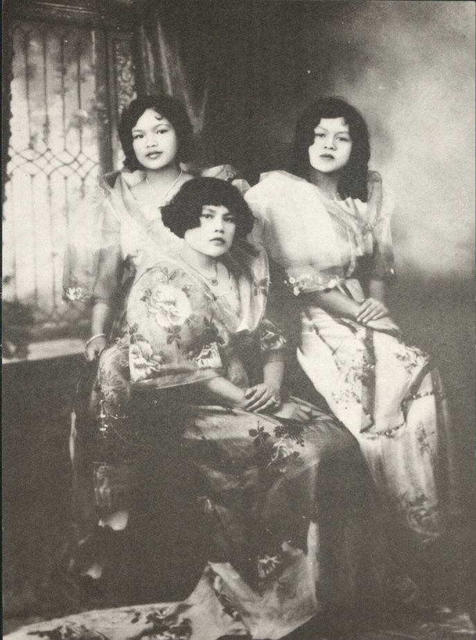Subject: Formal studio portait of three well-dressed Filipino American women, a mother and two daughters, seated before a window in Stockton, California circa 1930.