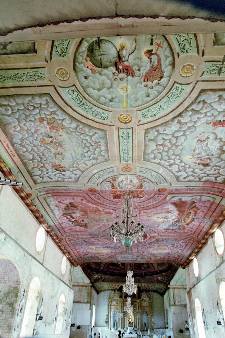 Subject: Interior view of mural painted ceiling of Santa Cruz Parish Church in Maribojoc, Bohol, commonly known as Maribojoc Church. "The ceiling paintings were known to be works of Raymundo Francia,