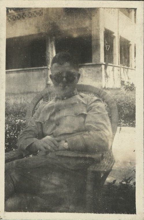 Subject: Captain Denney, father of the baby Mary Anne, relaxes in a wicker chair outdoor at Fort Mills.