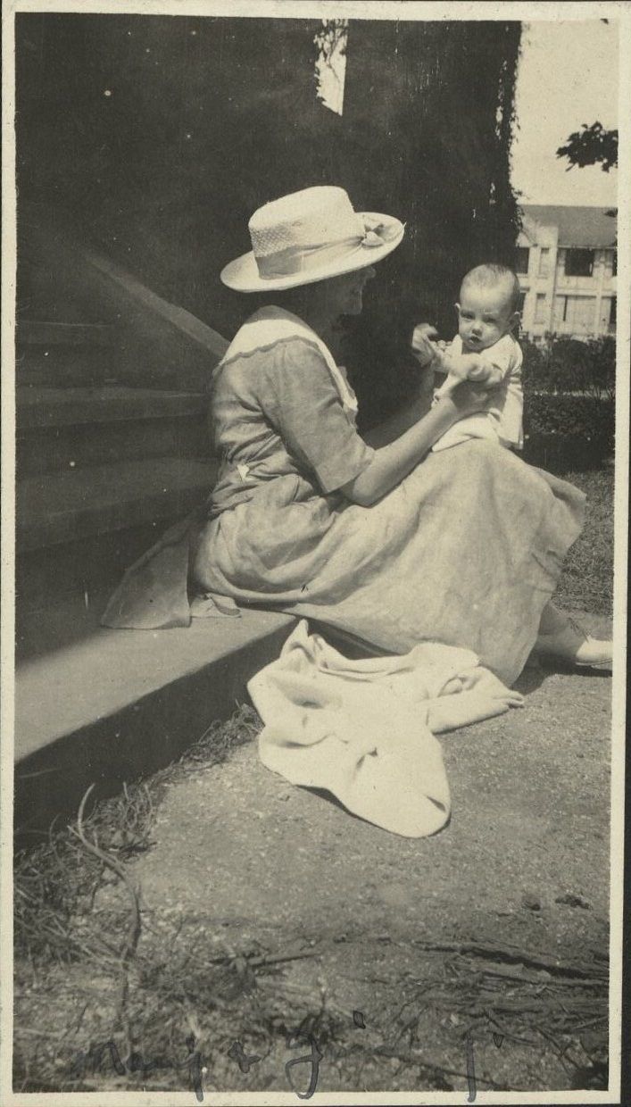 Subject: An American woman and her baby on the steps of a building, perhaps at Fort Wint on Grande Island in Subic Bay.