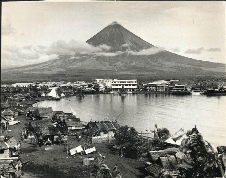 Subject: Mayon Volcanoseen behind Legaspi town and port area on Albay Gulf. A refreshingly more intimate and detailed view of the typical scene recorded from the vantage points in ROJR-000197, ROJR-00