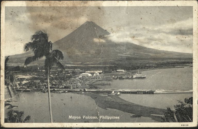 Subject: Mt. Mayon in background, town and port of Legaspi in foreground on Albay Gulf.