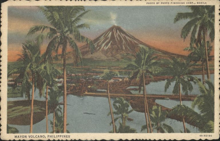 Subject: Mayon emitting puff of steam behind Legaspi town and port area on Albay Gulf.