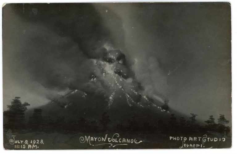 View of ash and steam clouds erupting and lava flowing down flanks of Mt. Mayon. Photo dated July 8, 1928, 11:15 a.m. This event was a relatively mild eruption by Mayon's standards.