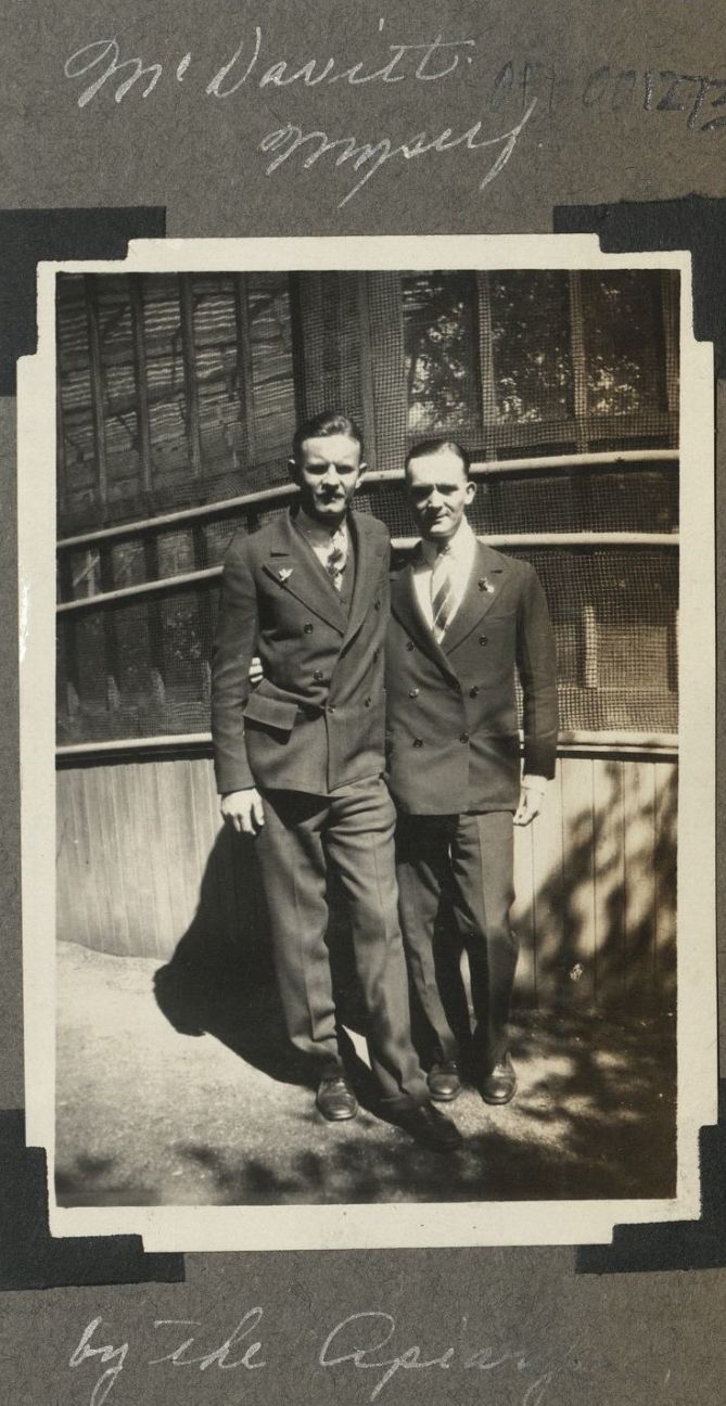 Subject: Lester Brundege (right) and an airman buddy in formal dress pose outdoors, probably by the birdhouses or monkey cages in Mehan Botanical Gardens. An "apiary" is actually a group of beehives,
