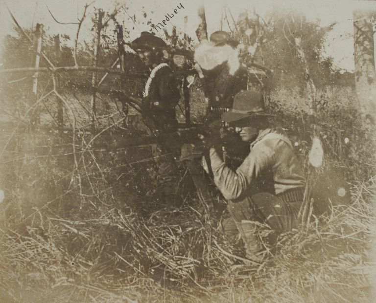 Subject: Rifleman Medley and two other U.S. soldiers aim their rifles as if to shoot in the brush.