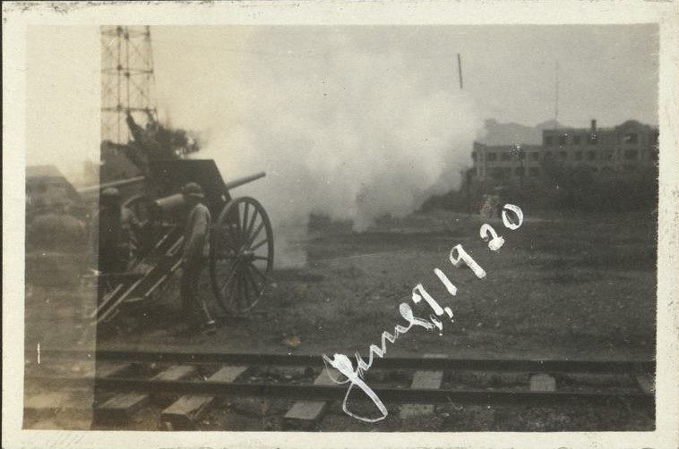 Subject: U.S. Army firing off howitzers as a military salute or tribute to honor Memorial Day. At Fort Mills, Corregidor Island, with radio tower and barracks in distance.