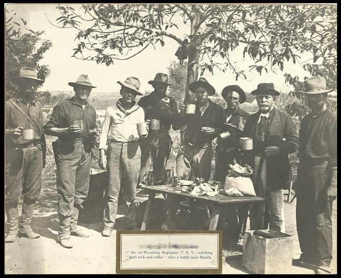 [Men] of the 1st Wyoming Regiment, U.S.V. [United States Volunteers], relishing "hardtack and coffee" after a battle near Manila.