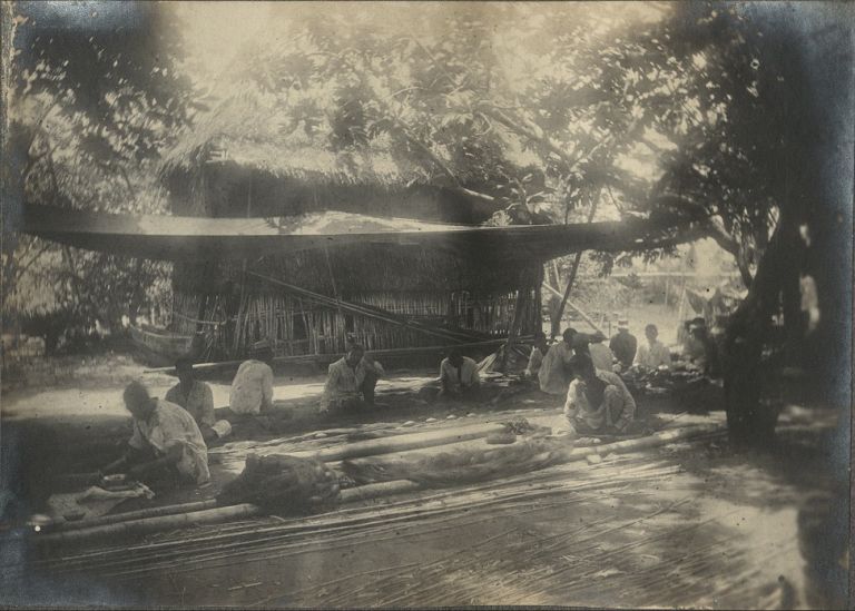 Subject: Group of men work on mending fishing nets in a shady clearing next to a nipa hut. See also OFI-002598.