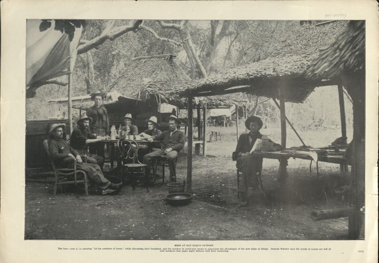 Subject: U.S. soldiers relax in chairs while a monkey sits on the table, no doubt stealing food. San Roque is connected to the Cavite Navy Yard by a causeway. For details on the battle her