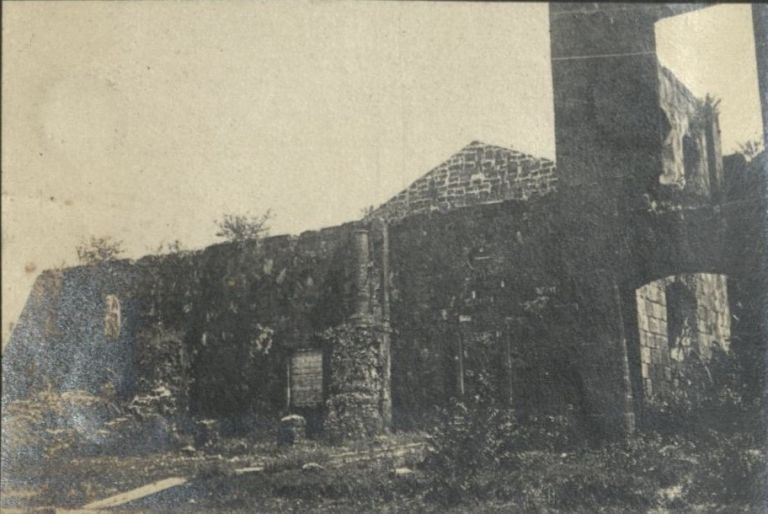 Subject: A late 1910s view of the buttressed walls of Miagao Church, also known as the Sto. Tomas de Villanueva Parish Church, in Miagao, Iloilo. It was also called the Miagao Fortress Church since i