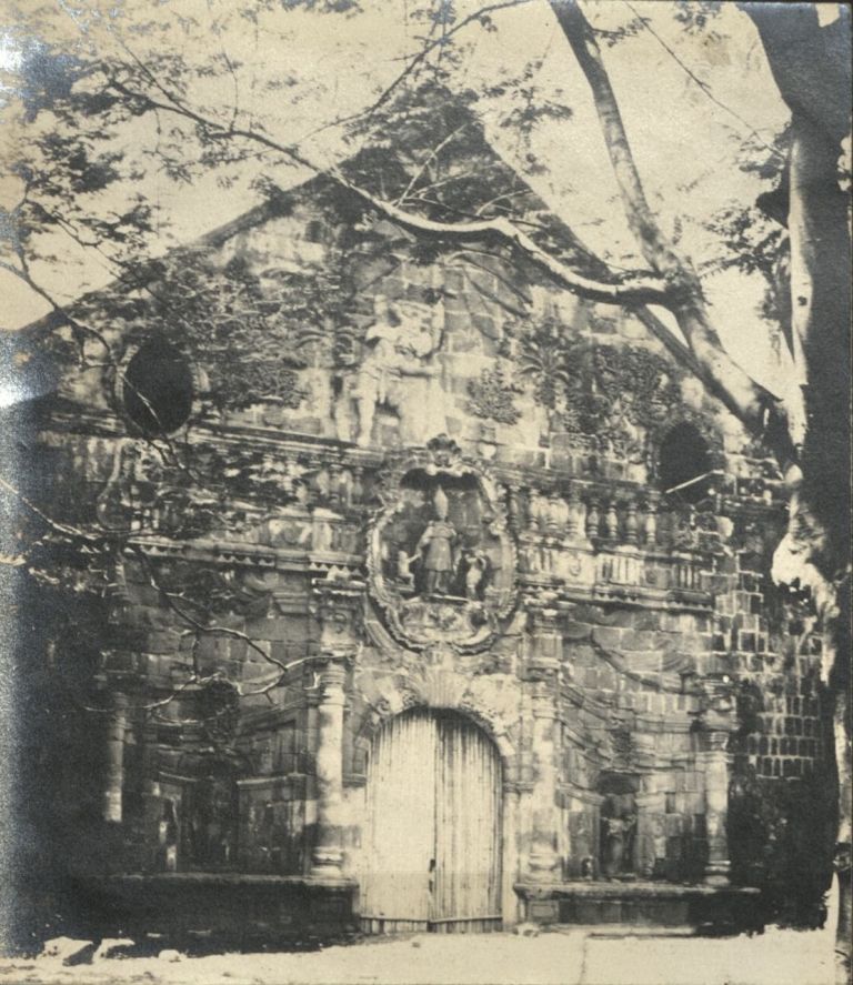 Subject: A late 1910s view of the stone carving and facade of Miagao Church, also known as the Sto. Tomas de Villanueva Parish Church, in Miagao, Iloilo. It was also called the Miagao Fortress Church