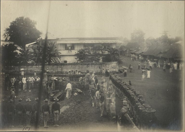 Subject: Pallbearers lower a casket into a grave during funeral service for a comrade presumably killed in the Philippine-American War while rows of soldiers stand at attention. The locatio