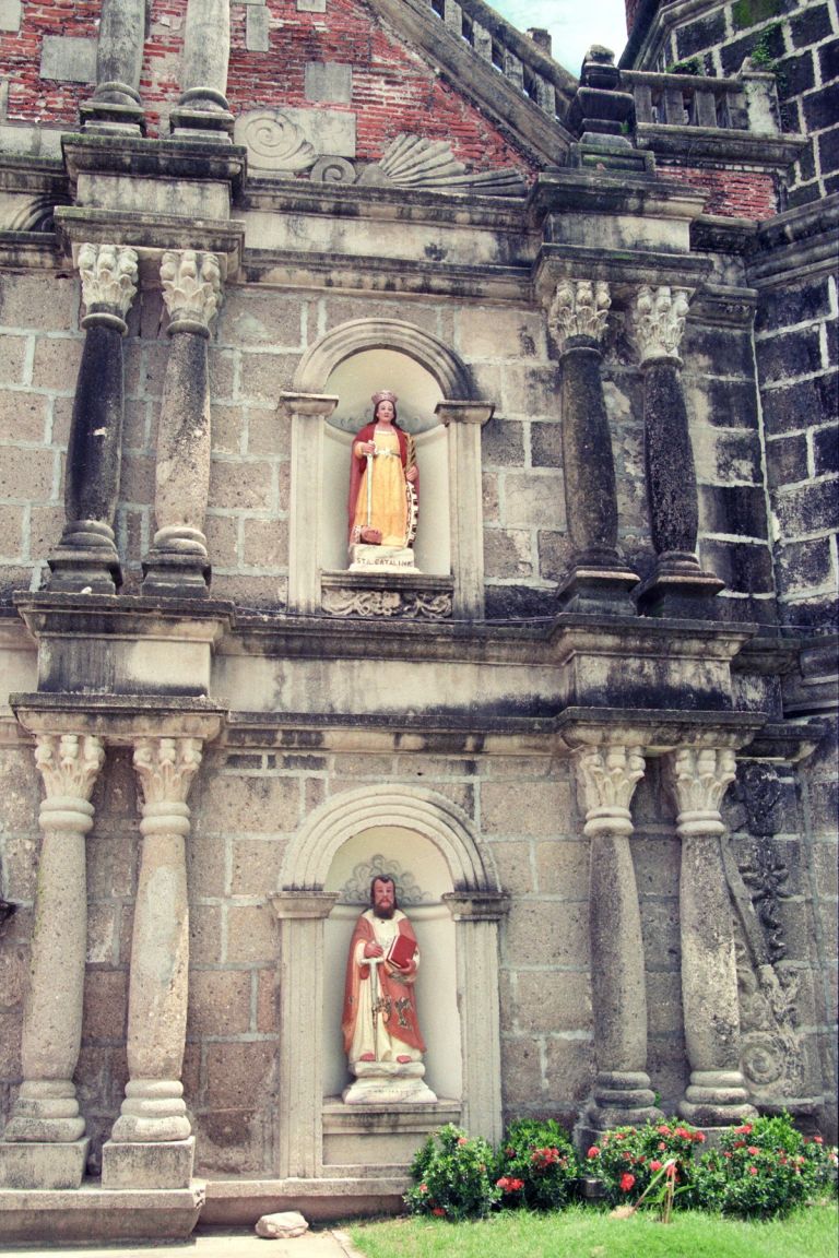 Subject: Statues and carved stone columns on the Baroque facade of Santa Monica Parish Church, also known as Minalin Church in Pampanga. The church probably was completed in 1764 (sources vary) and wa