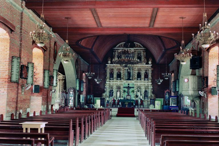 Subject: Church interior, pews, ceiling, altar, and retable of Santa Monica Parish Church, also known as Minalin Church in Pampanga. The church probably was completed in 1764 (sources vary) and was re