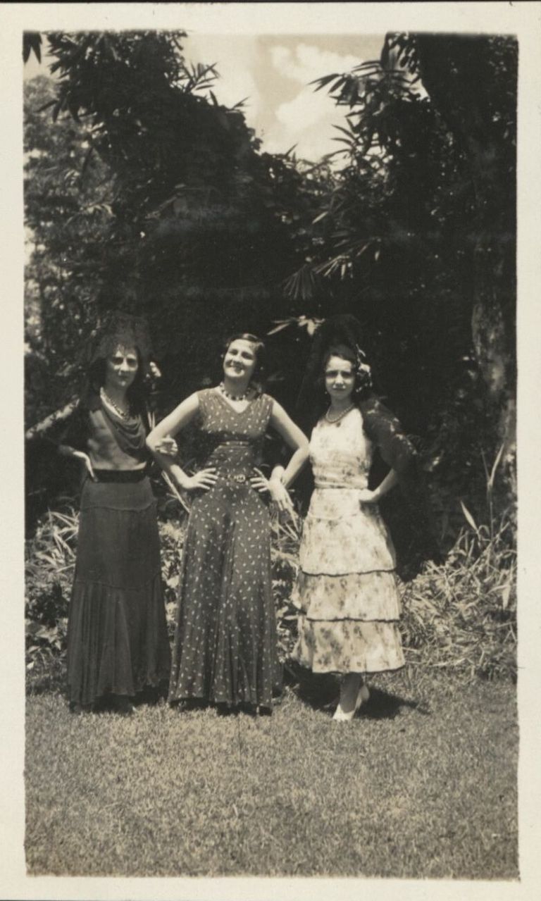 Subject: Three young women of Spanish heritage outdoors in formal dress. Harry Jr. left no description of how he knows these women or what event is pictured.