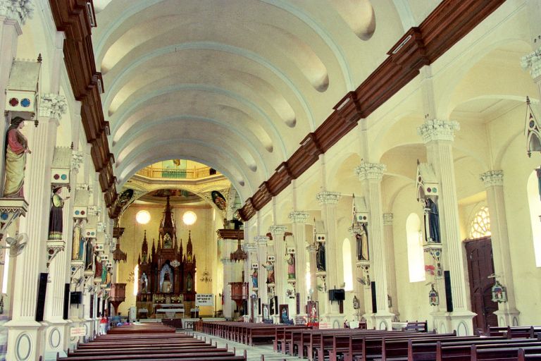 Subject: Interior view with statues, pews, ceiling, and altar of the neogothic style Molo Church, officially the Church of St. Anne Parish, which lies in front of the plaza in the Molo District of Ilo