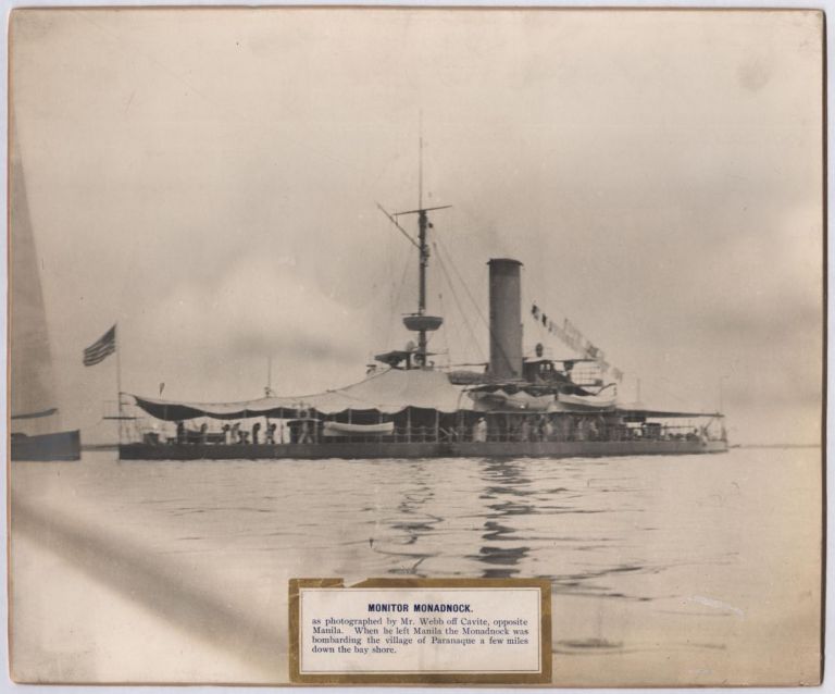 The monitor Monadnock, an ironclad warship with low sides, on which heavy guns are mounted within one or more iron turrets, which may be rotated so that the guns may be made to bear in any position. Full caption reads: "Monitor Monadnock. as photographed by Mr. Webb off Cavite, opposite Manila. When he left Manila the Monadnock was bombarding the village of Paranaque a few miles down the bay shore."