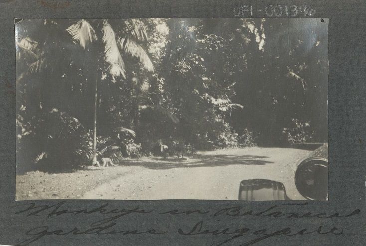 Subject: Monkeys at the base of a palm. The Singapore Botanic Gardens was founded at its present site in 1859 by an agri-horticultural society. It is one of three gardens, and the only trop