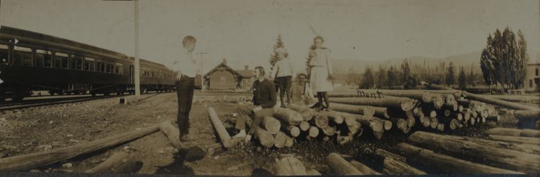 Subject: A family sits and stands on logs at a railroad station while waiting to board the passenger cars nearby. Probably on the Northern Pacific Railroad line.