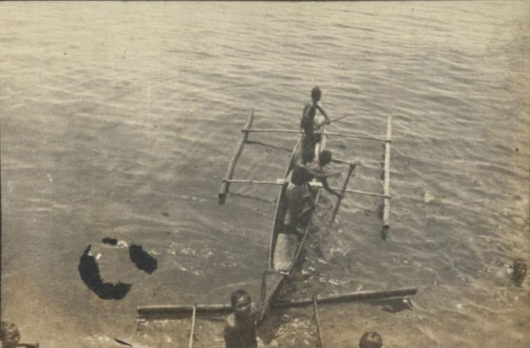 Subject: Children swimming among outrigger canoes. Typically these scenes depict coin divers, who often greeted arriving ships. See also OFI-004339, ROJR-001551 and ROJR-001616.