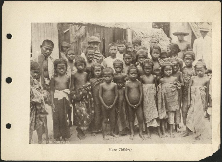Subject: A big group of Philippine Muslim ("Moro") children pose in a village in Mindanao. Givens was the post photographer at the Presidio of San Francisco starting in 1899. In 1900 he tr