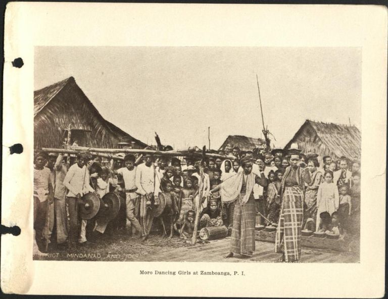 Subject: Two Muslim women perform traditional dance to drum rhythms before their village in Zamboanga. Same image as OFI-001470. Givens was the post photographer at the Presidio of San Fra