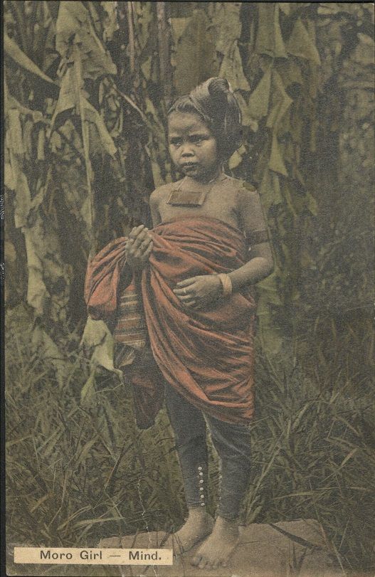 Subject: Muslim girl in Mindanao with hair tied up, holding dress, stands before hemp plants.