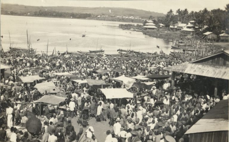 Subject: Market scene with many people crowding many boats at shore of Lake Lanao. Dansalan, now known as Marawi, lies on the shores of Lake Lanao. See also OFI-000599 and ROJR-000851.