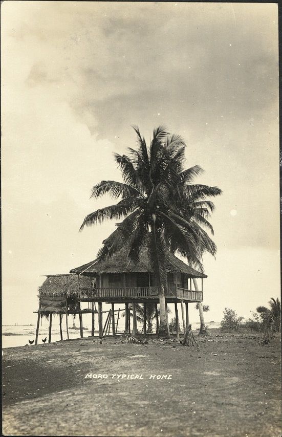 Subject: Elevated Moro (Philippine Muslim) house on beach in Mindanao next to large coconut tree.