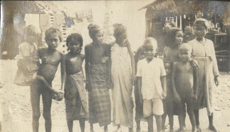 Subject: Group of 11 Muslim children pose for a group portrait in a Mindanao village. See the same group informally in OFI-004379.
