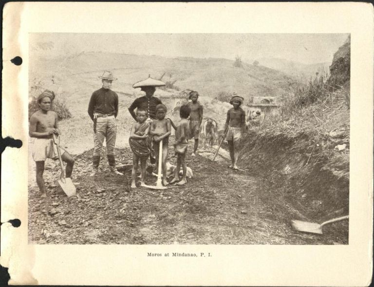 Subject: U.S. soldier supervises local workers with picks and shovels on road construction near Lake Lanao. The abutments of the old Spanish bridge over Agus River can be seen in backgroun