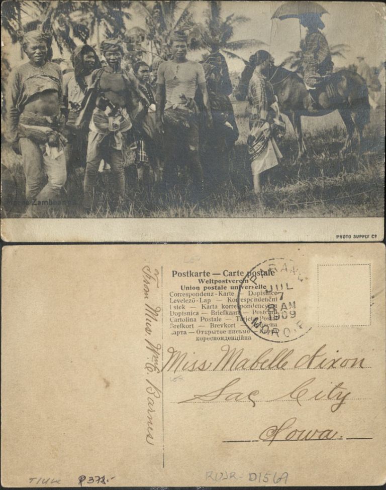 Subject: Group of Muslim men and women stand in clearing in Zamboanga, one person on horseback holds umbrella.